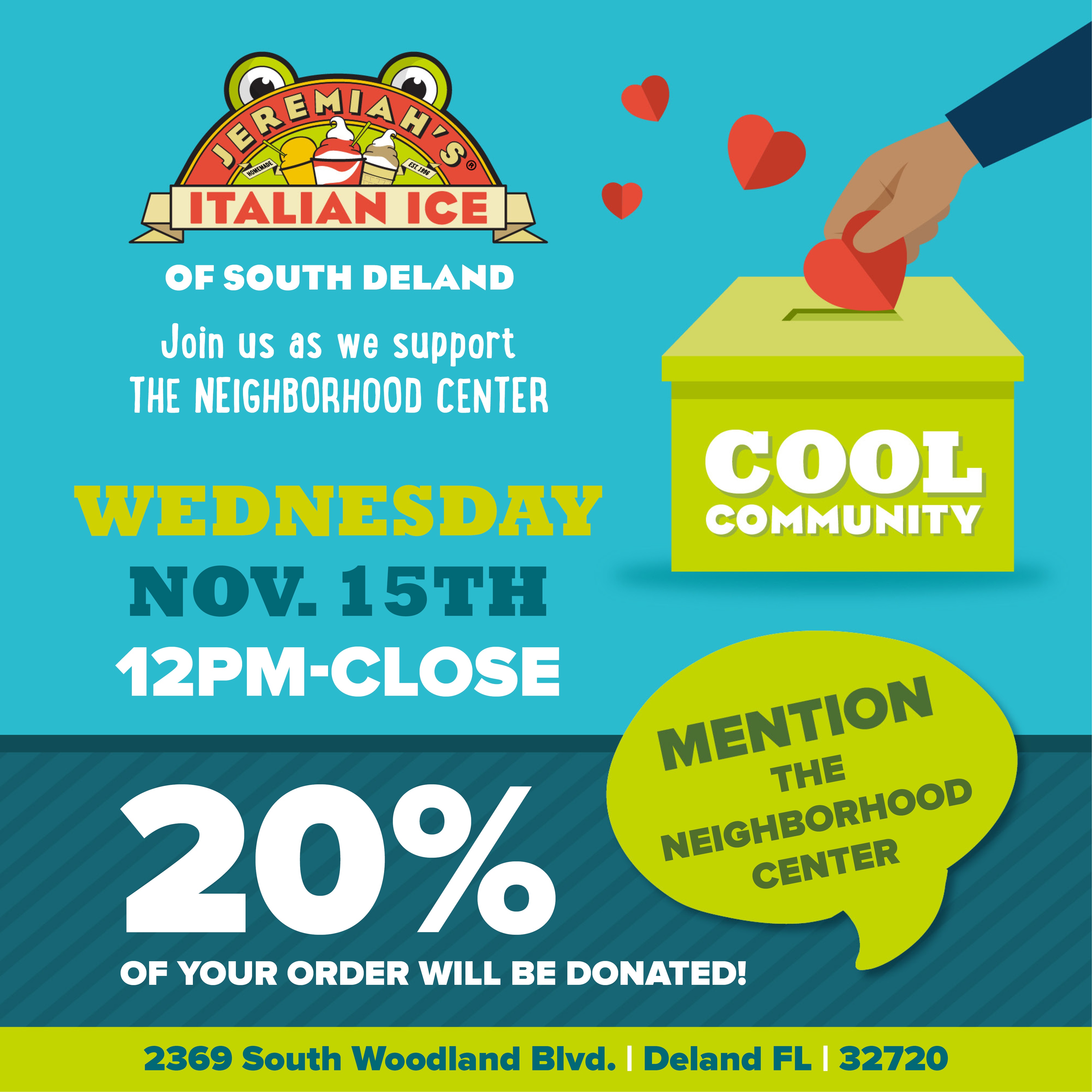 Whit's DeLand - 20 percent of proceeds will be donated to the Neighborhood Center on orders where customers mention "realchange"Jeremiah's Italian Ice of South DeLand - 20 percent of proceeds will be donated to the Neighborhood Center on orders where customers mention “The Neighborhood Center. Click here Version OptionsSpare Change for Real ChangeHeadline to see flyer.